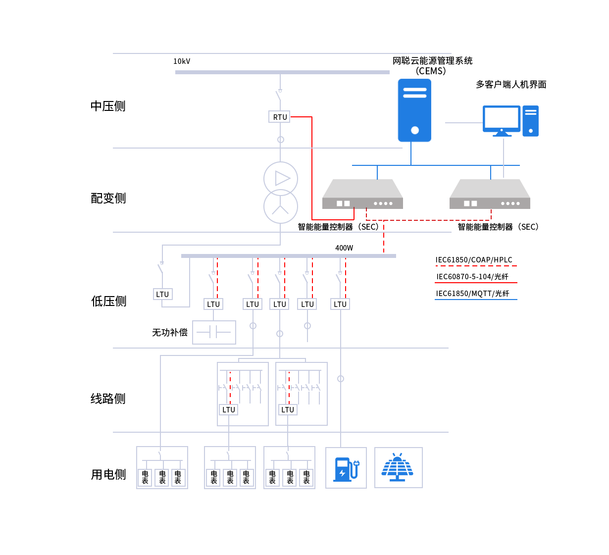 网聪低压物联网终端(LTU)分布部署在园区低压出线、电缆分支箱、配电盘、表箱等处,通过载波、WIFI或串口等方式北向接入网聪智能能量控制器。具备遥测、遥信及遥控三遥功能及短路故障检测、漏电故障检测、串并联电弧故障监测、潜伏性故障检测、故障录波等故障检测功能。用于线路监测及实现对传统负荷进行可控改造等。